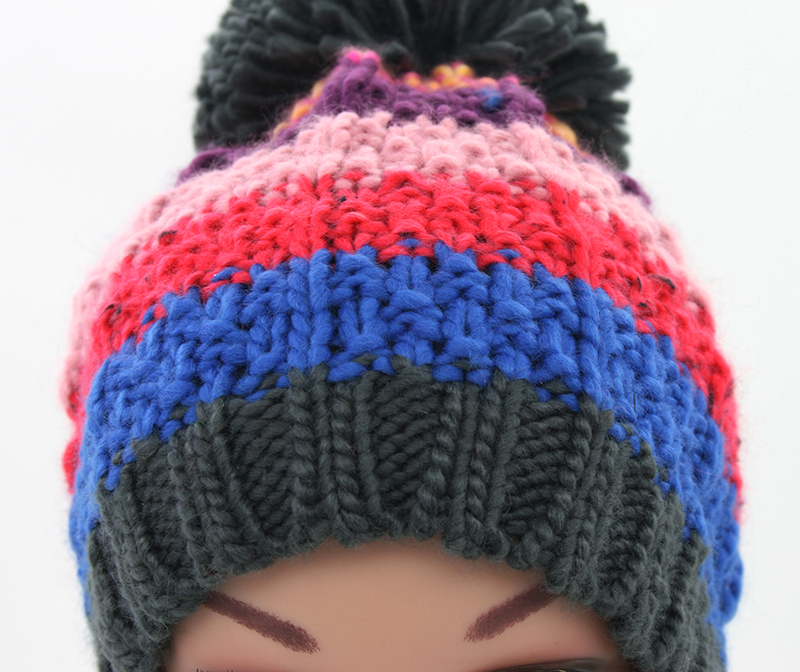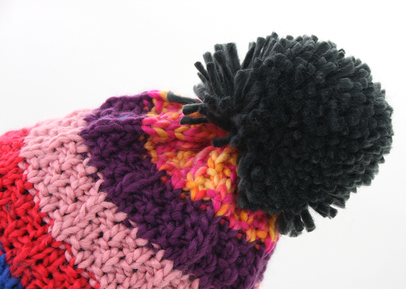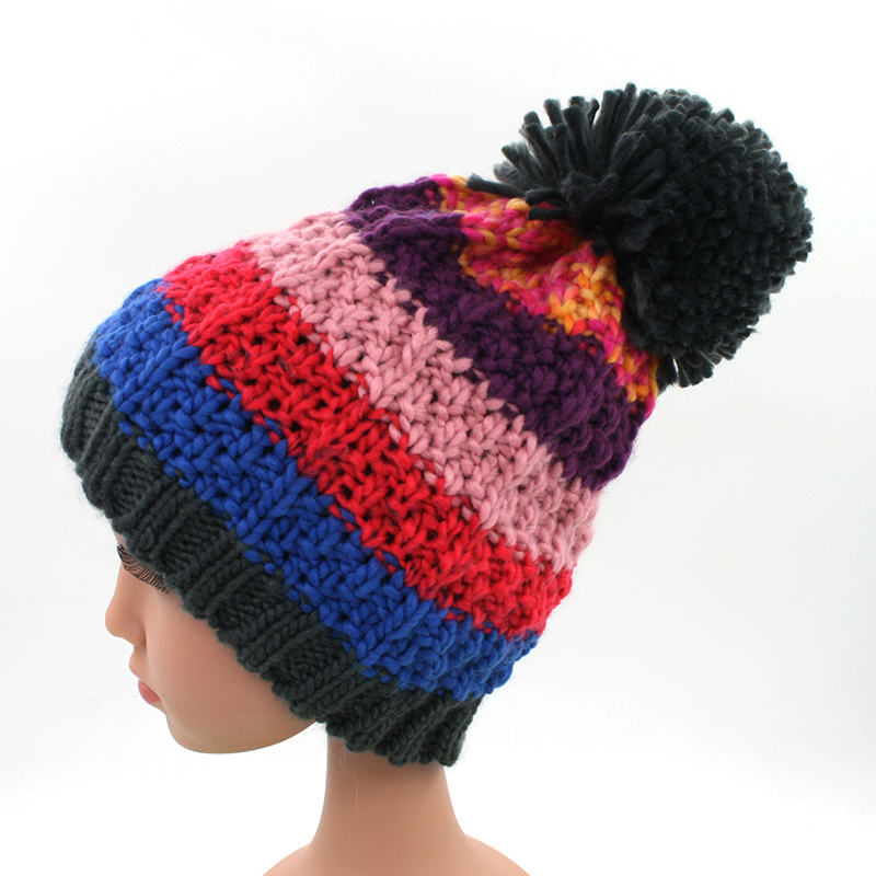 This thick, colorfule striped knit pom pom hat will keep your kids so warm and cuddly, you will want to see your cutie-pie in each color!